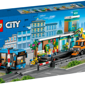 El set Estación de Tren cuenta con terminal, autobús, camión de mantenimiento ferroviario y de carretera, baño portátil, paso a nivel con base de carretera y 6 minifiguras.