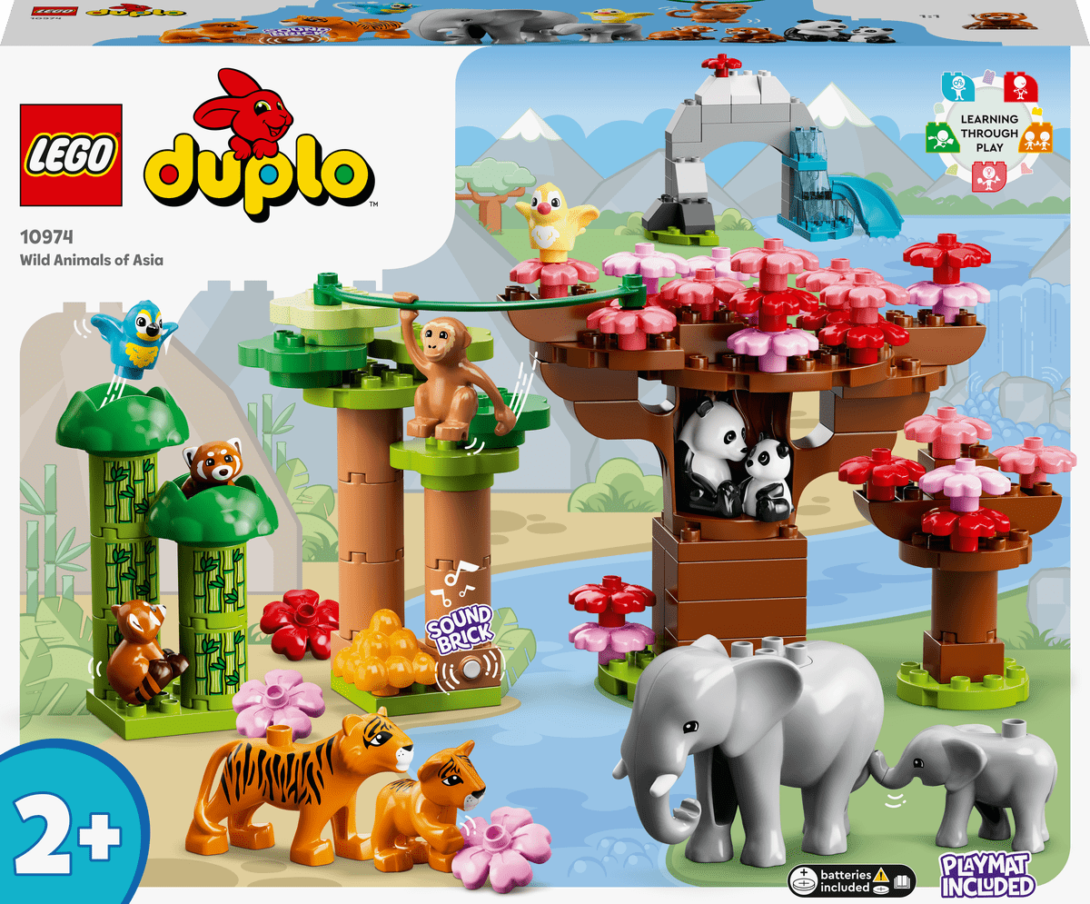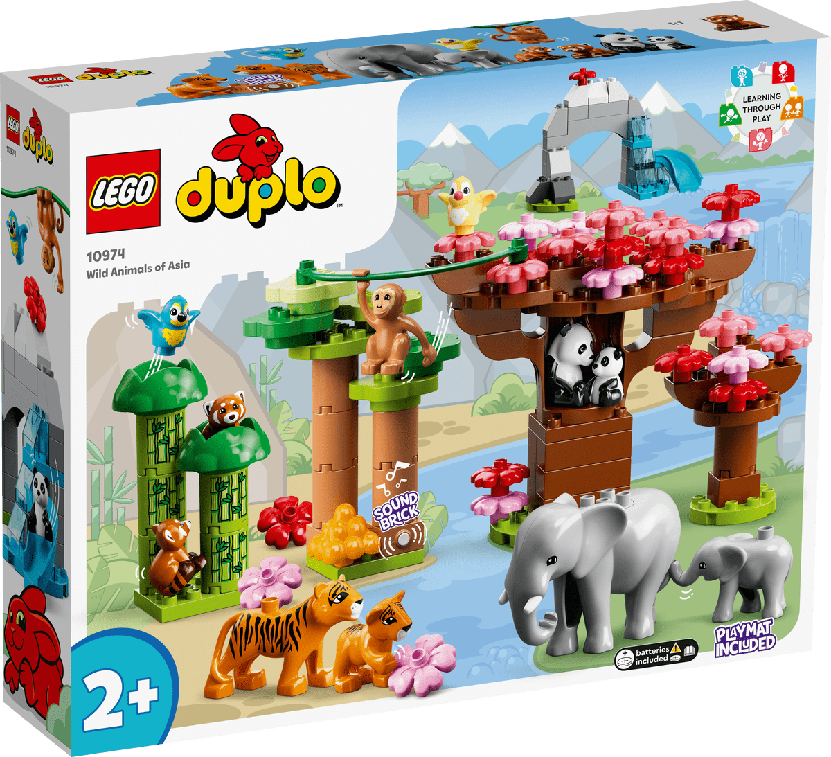¡El juguete LEGO® DUPLO® Fauna Salvaje de Asia (10974) está repleto de divertidos detalles y asombrosos animales que despertarán en los niños de 2 años o más la fascinación por las especies salvajes!Preescolares y papás pueden explorarlo todo juntosLas infinitas posibilidades de juego de este entorno asiático lleno de vida silvestre cautivarán a cualquier peque atraído por los animales. Es el hogar de un ejemplar adulto y una cría de elefante, un ejemplar adulto y un cachorro de panda y detigre, un mono, 2 pájaros y 2 pandas rojos, y en él hay también bambú y un cerezo en flor. Además, contiene un tapete de juego tridimensional plegable e incluso un ladrillo con sonido que reproduce voces de animales y un ambiente sonoro realista.Aprendizaje lúdico para bebésTodos los sets LEGO DUPLO, diseñados por expertos, plantean divertidas historias y cuentan con colores brillantes, personajes diversos y montones de detalles para dar a tu peque de mente curiosa un GRAN comienzo en lavida.