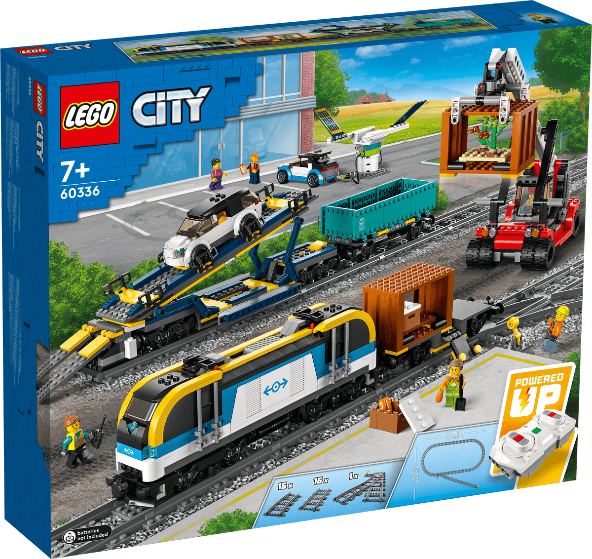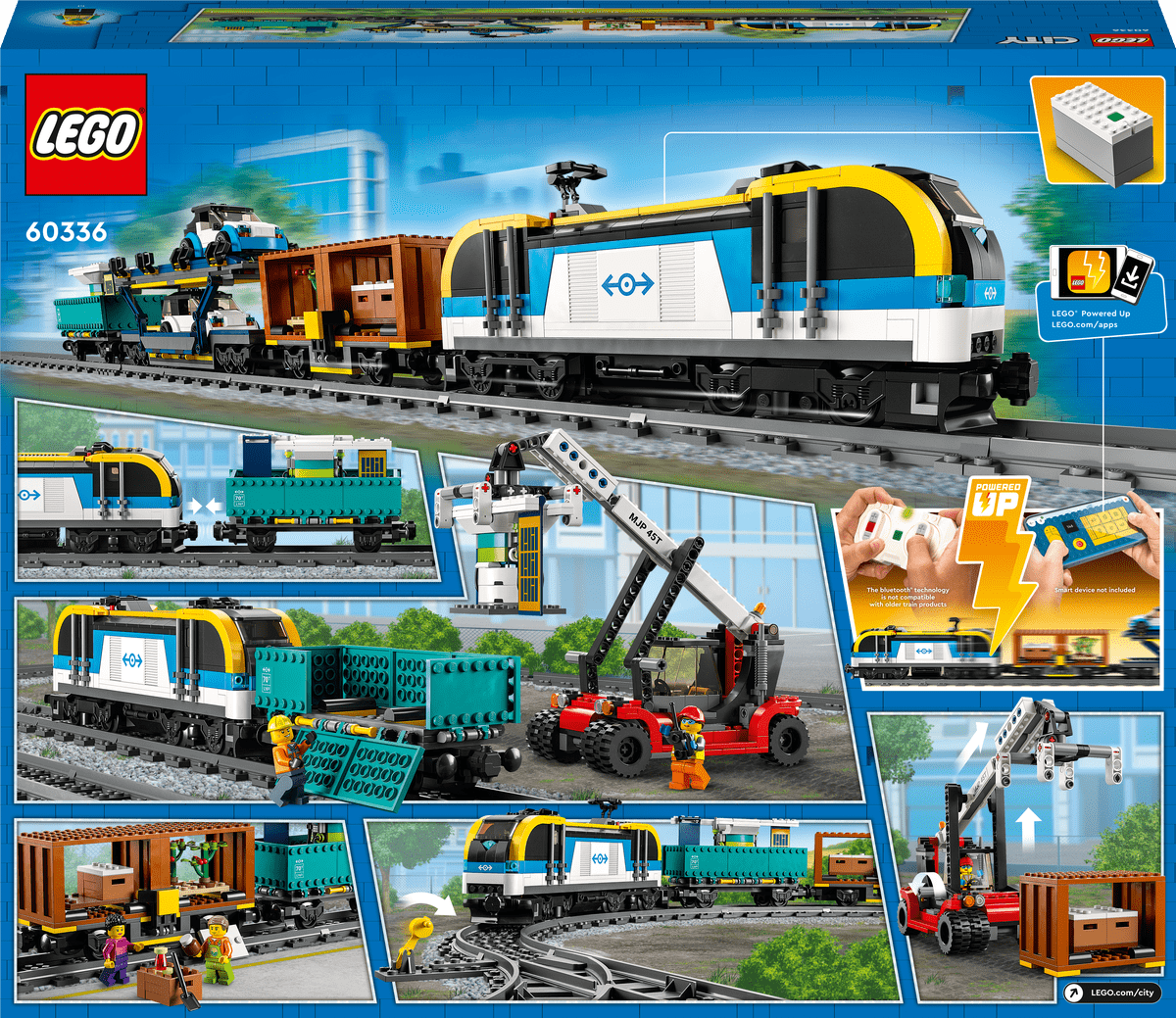 ¡Un regalo épico para peques y aficionados a los ferrocarriles! El Tren de Mercancías LEGO® City (60336) teledirigido está lleno de detalles y funciones realistas e incluye una locomotora con tecnología LEGO Powered Up, un vagón plataforma con 2 contenedores, un vagón abierto, un vagón portavehículos de dos niveles y 33 tramos de vía. Agrega el manipulador telescópico, los 2 vehículos eléctricos de juguete, la carga y las 6 minifiguras, ¡y a vivir infinitas aventuras ferroviarias!Para niñosy entusiastas de los trenesEste increíble set con un tren de juguete construible contiene una guía de construcción fácil de seguir para cada modelo, apta para mayores de 7 años. Los peques pueden construir solos o unirse a amigos y familiares para disfrutar de una fantástica experiencia de construcción y juego en grupo.Más que simples juguetes infantilesLos sets LEGO City convierten a los niños en los protagonistas de emocionantes historias que reflejan la vida real de una forma divertida.