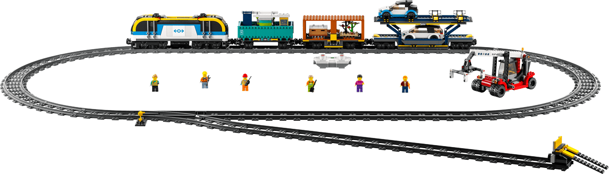 Set Tren de Mercancías LEGO® Powered Up con 33 tramos de vía, una locomotora, un vagón plataforma, un vagón abierto, un vagón portavehículos, 2 vehículos eléctricos, un manipulador telescópico y 6 minifiguras.