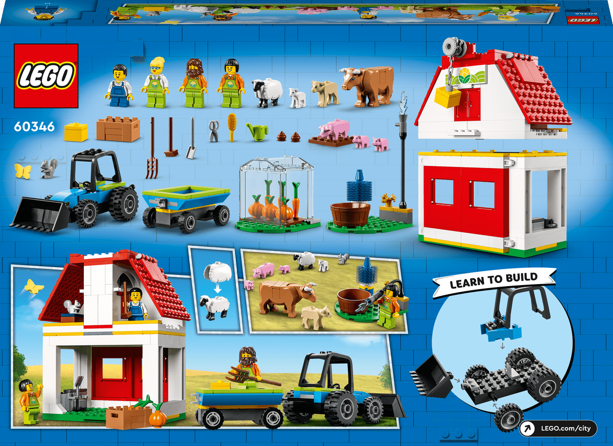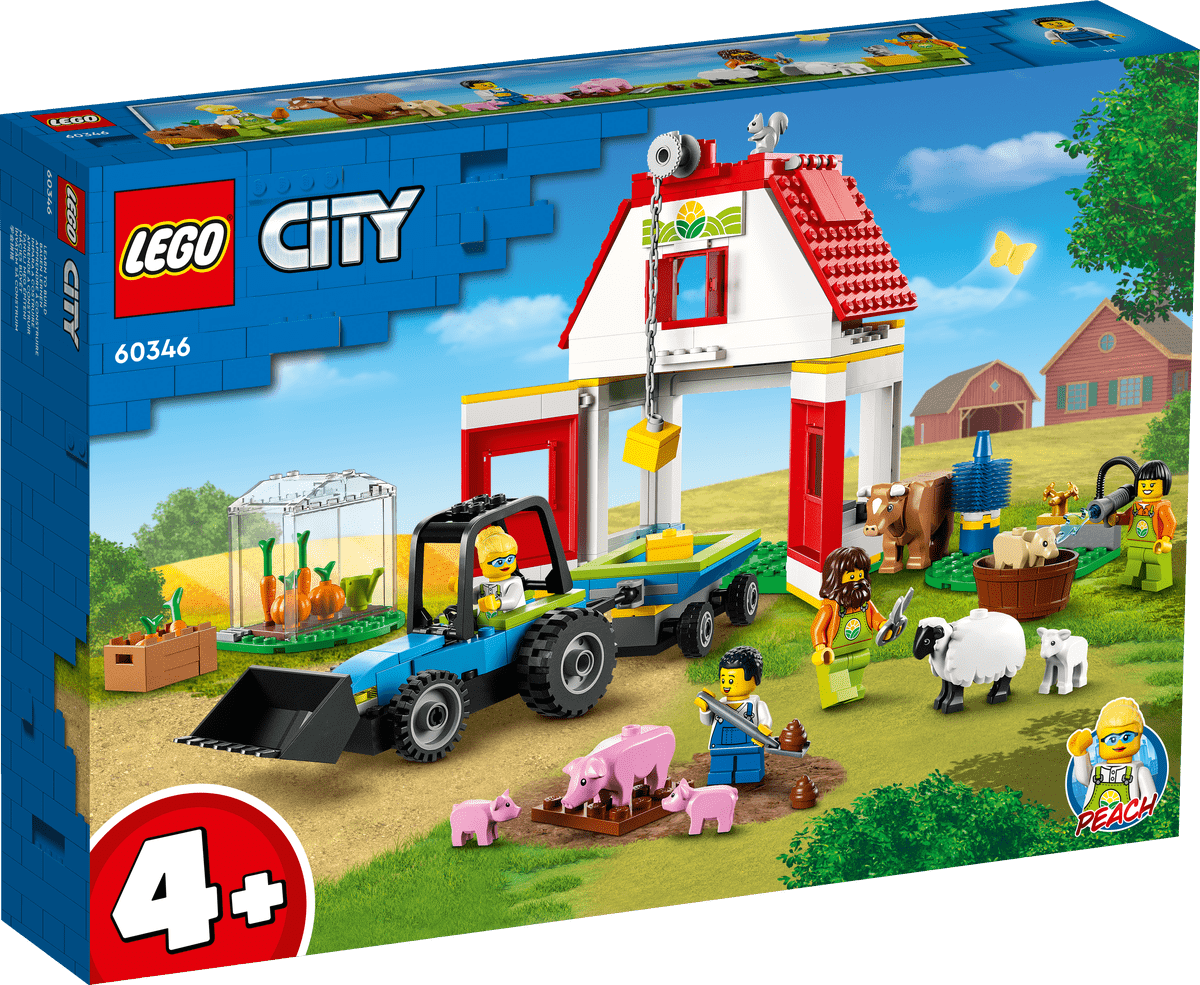 Vive divertidas aventuras en la granja con el set LEGO® City Granero y Animales de Granja (60346), que incluye un granero de juguete con polea que funciona, un fabuloso tractor con remolque, un invernadero y un montón de simpáticos animales de granja. Este set, perfecto para pasarlo genial jugando a solas o con amigos y familiares, trae 4 minifiguras, entre ellas Peach, el personaje LEGO City de la tele.Diseñado para niños de 4 años o másEste set de construcción 4+ contiene una guía en imágenes y un ladrillo LEGO para principiantes: una base premoldeada sobre la que empezar a construir. También cuenta con instrucciones de construcción digitales, disponibles en la app gratuita Instrucciones de Montaje LEGO. Esta guía interactiva permite a los peques visualizar, acercar y girar cada modelo desde todos los ángulos mientras construyen.Juguete para jugar y aprenderLos sets de granja LEGO City ayudan a recrear la vida cotidiana de una forma imaginativa, libre, divertida y emocionante.