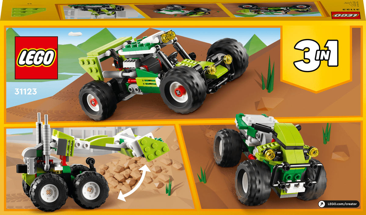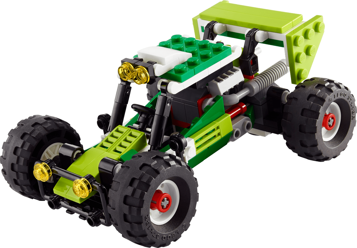 Regala a tu fan de los vehículos el set de construcción LEGO® Creator 3en1 Buggy Todoterreno, que puede convertirse en una cargadora compacta o en un quad.