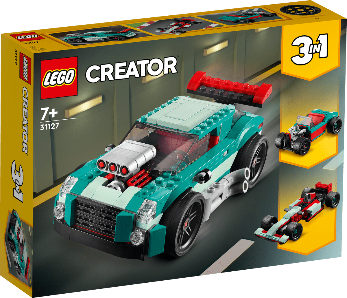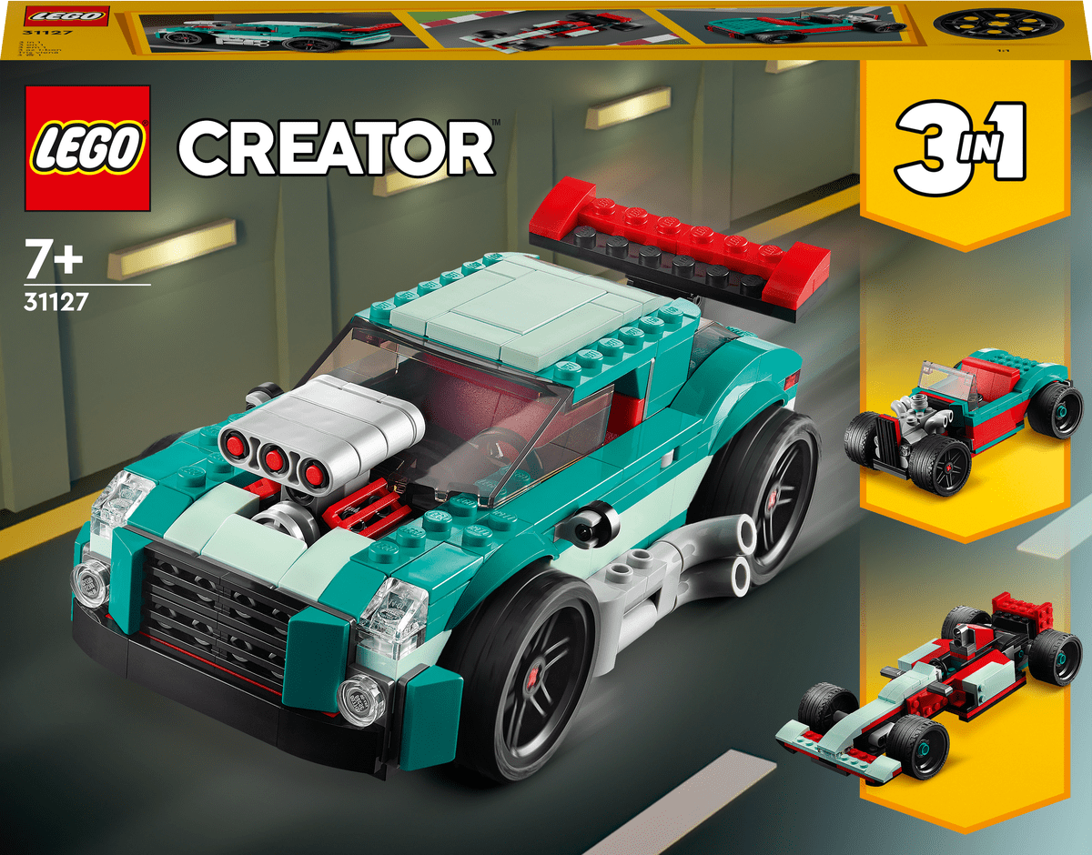 Los fans de los vehículos superrápidos podrán competir en las calles o en los circuitos con el sensacional set de construcción LEGO® Creator 3en1 Deportivo Callejero (31127). A tu peque de 7 años o más le encantará interpretar carreras con este potente deportivo trucado de juguete, equipado con alucinantes tubos de escape laterales, alerón y techo desmontable.Infinitas opciones para jugar a las carrerasLos niños disfrutarán de 3 experiencias de construcción y juego diferentes con este setde juguetes LEGO Creator 3en1. Podrán construir el potente Deportivo Callejero de juguete y, después, convertirlo en un coche de carreras, transformarlo en un automóvil clásico rojo y turquesa modificado a medida o usar su imaginación para crear otro superbólido.Una experiencia digital para constructores LEGOEste set viene con instrucciones de construcción digitales interactivas que aportan aún más diversión al proceso, disponibles en la app gratuita Instrucciones de Montaje LEGO.