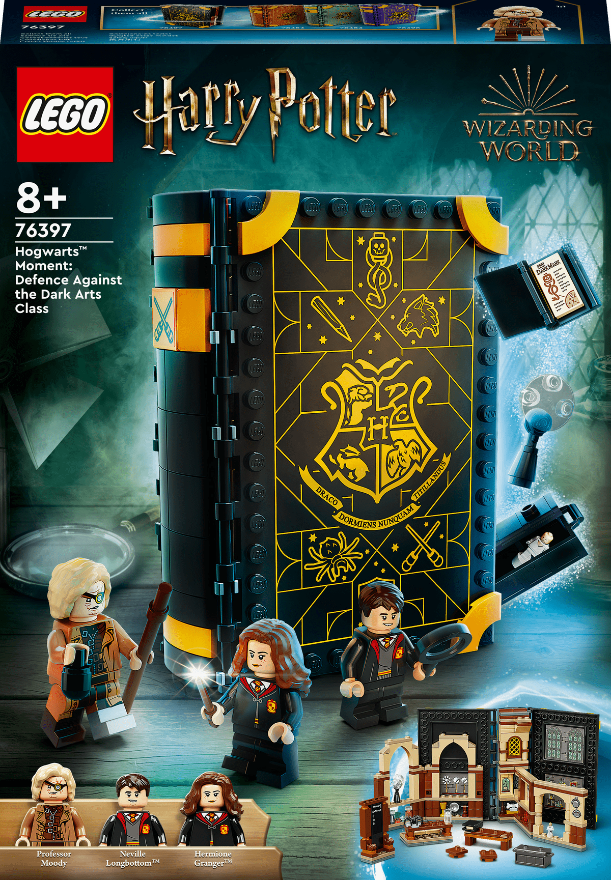 Los niños abrirán el libro para construir con ladrillos y entrarán en el aula de Hogwarts™ donde se imparte la asignatura de Defensa Contra las Artes Oscuras, repleta de populares personajes y detalles.