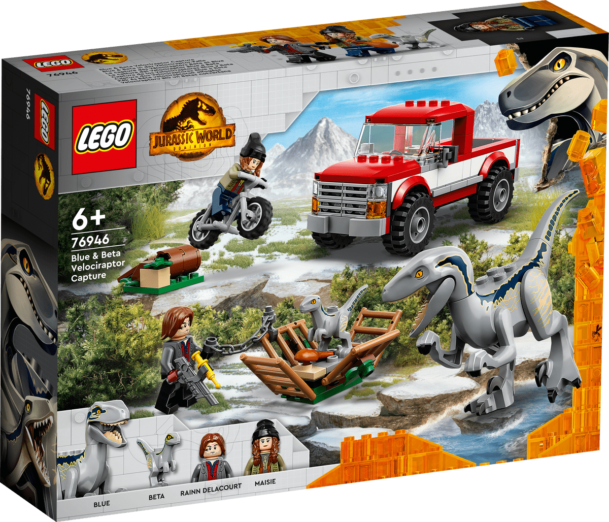 A los niños con pasión por los dinosaurios y los vehículos les encantará el set LEGO® Jurassic World Captura de los Velocirraptores Blue y Beta (76946). Inspirado en una emocionante escena de la película Jurassic World Dominion, cuenta con una furgoneta de juguete construible, una moto, una jaula para dinosaurios con función de trampa y un elemento que representa un muslo de pollo como cebo.Juego creativoEste juego de juguetes para mayores de 6 años contiene también 2 minifiguras, Maisie yRainn Delacourt (con un arma de dardos tranquilizantes), y figuras de los dinosaurios Blue y Beta que animarán a los niños a imaginar e interpretar sus propias historias. Todos los peques, incluso los constructores principiantes, podrán montar las maquetas con confianza siguiendo las sencillas instrucciones de la caja. Además, el set combina genial con otros juguetes de construcción LEGO Jurassic World que llenarán de trepidantes aventuras las sesiones de juego.