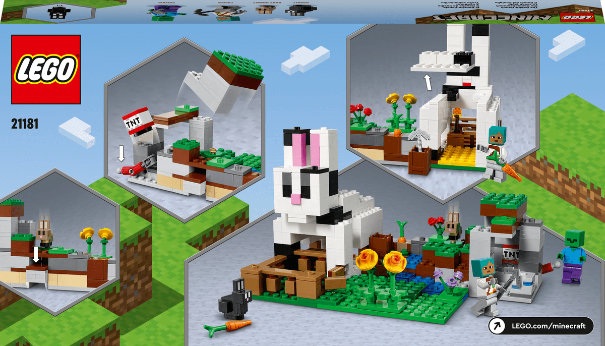 Los jugadores de Minecraft® y los amantes de unos adorables animalitos, los conejos, lo pasarán genial con las infinitas posibilidades de juego creativo del set LEGO® Minecraft El Rancho-Conejo (21181).Construcción y batallas para cuidar de los conejosLos niños de 8 años o más construirán un rancho con forma de conejo gigante para cuidar de sus suaves y esponjosos amiguitos Minecraft. La parte posterior abierta de la estructura y el techo desmontable les permitirán organizar el mobiliariofácilmente y disfrutar de imaginativos juegos de interpretación dentro. En el exterior, hay 2 conejos que alimentar con zanahorias cultivadas en la granja aledaña, ¡y podrán hacerlos saltar accionando una palanca! Pero, en una cueva cercana, se oculta un emblemático enemigo Minecraft: un zombi. Los peques deberán rechazar sus ataques con una espada para poder regresar al lado de sus queridos conejitos. Este set reconfigurable pondrá las emociones del videojuego Minecraft en sus manos.