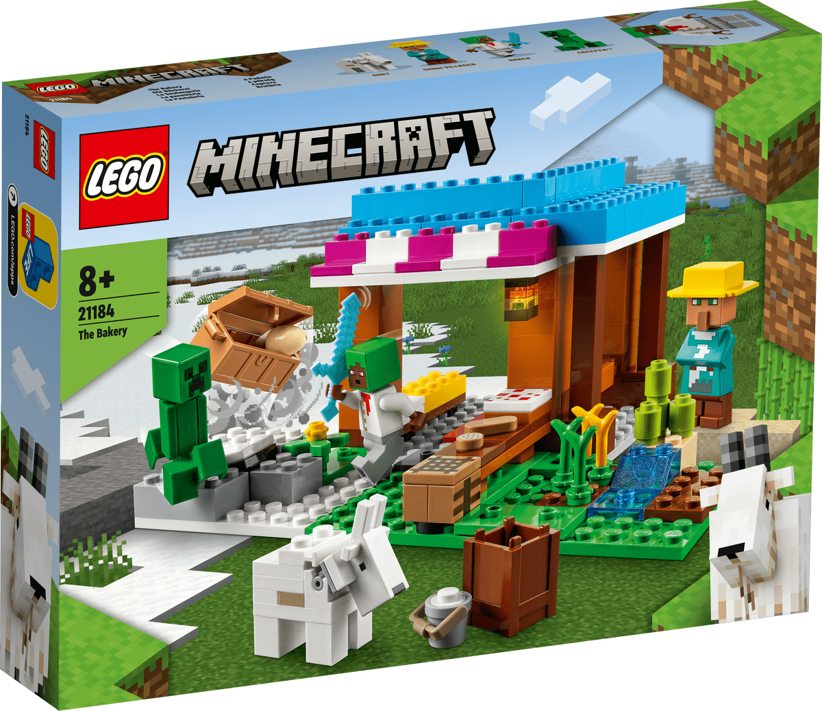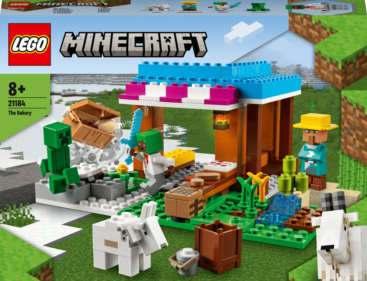 La Pastelería LEGO® Minecraft® (21184), repleta de personajes Minecraft, accesorios y funciones, es un entretenido regalo para niños a partir de 8 años.Diversión reconfigurable para peques creativosEste set Minecraft lleno de actividad rebosa posibilidades de juego. Incluye un fantástico elenco de personajes Minecraft: un pastelero, un aldeano de las nieves, una cabra y un Creeper™. La concurrida Pastelería cuenta con una sala amueblada donde los niños pueden interpretar historias inspiradas en la vida doméstica. Antes de hornear el pan y las galletas, tienen que reunir los ingredientes. Para conseguir trigo, ayudarán al granjero a cultivarlo y luego obtendrán leche ordeñando la cabra. Por último, darán rienda suelta a su creatividad con el pastelero en la cocina. Aún les esperan más emociones: un temible Creeper está al acecho, decidido a destruir el cofre que contiene un valioso huevo. Pero podrán usar un arma Minecraft clásica para defender la Pastelería: una espada de diamante.