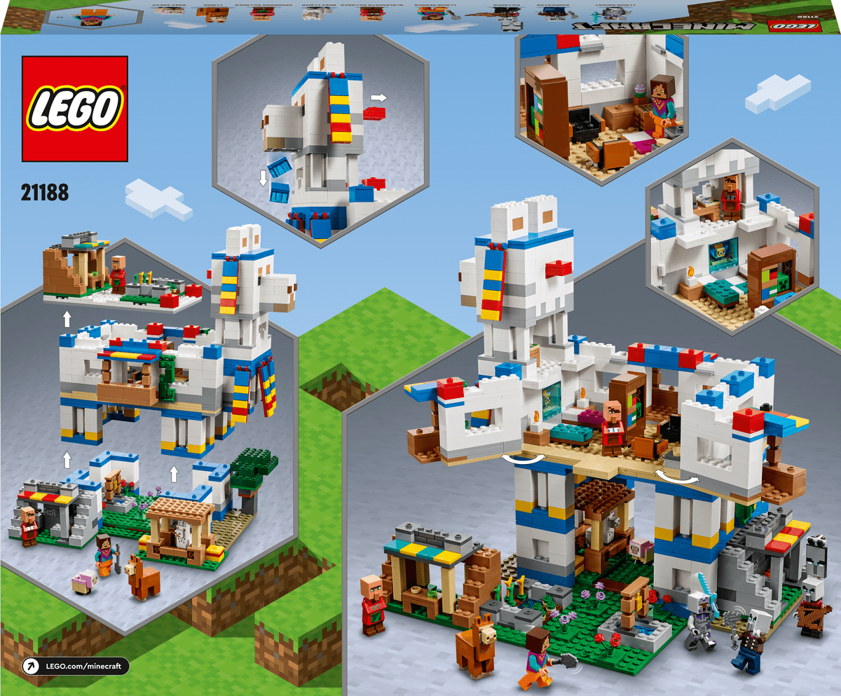 Regala a tu jugador de Minecraft® de 9 años o más un set que encantará a sus amigos con pasión por Minecraft. El Pueblo-Llama LEGO® Minecraft (21188) combina aventuras al estilo Minecraft con la creatividad tangible de los ladrillos LEGO en un megaset modular ideal para jugar y exponer.Diversión sin límitesLos jugadores de Minecraft podrán aplicar sus habilidades de construcción en el mundo real con este inspirador juego que contiene personajes Minecraft clásicos: un pastor de llamas, un guerrero llama, un aldeano de la sabana, un aldeano herrero, un saqueador, un vindicador, una llama, una llama bebé y una oveja bebé. La gran llama se abre para que los peques exploren y personalicen las habitaciones amuebladas del interior. En el exterior, tendrán que cuidar de animales y también hay 6 módulos personalizables que pueden colocar tanto alrededor de la llama como entre sus pezuñas o incluso en el lomo. Al accionar el arma secreta, ¡la llama “escupe” a las criaturas hostiles atacantes!