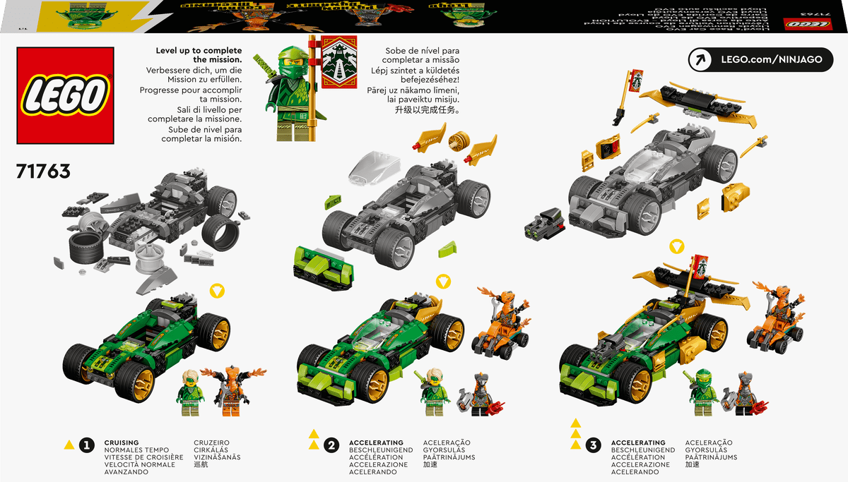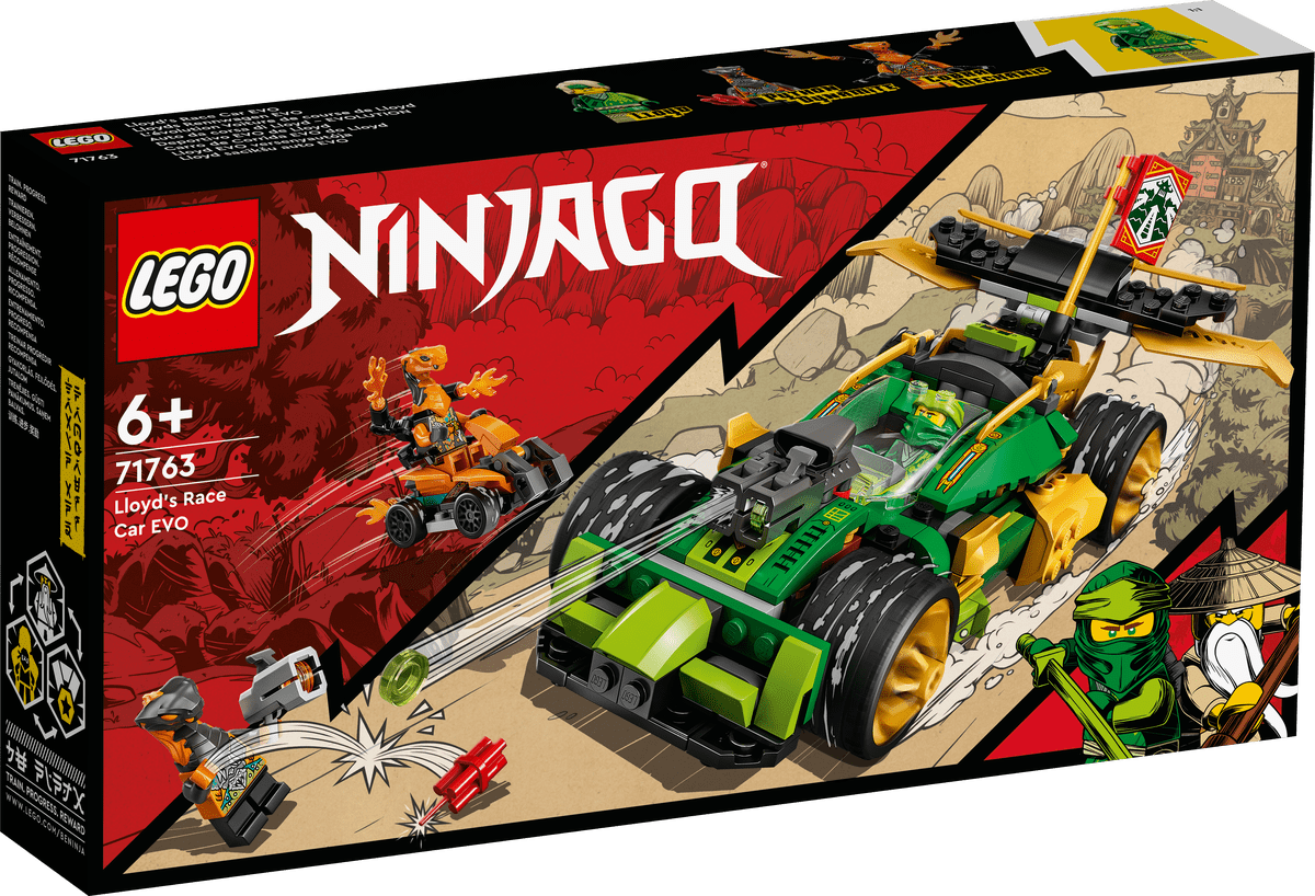 Los fans de LEGO® de 6 años o más interpretarán apasionantes aventuras llenas de acción durante horas con el impresionante juego Deportivo EVO de Lloyd (71763). En 3 fases sucesivas, el vehículo de juguete se puede transformar de un buggy en un potente coche ninja blindado con cañones, alerón con espadas y paneles dorados.El bien contra el malEste set de construcción incluye 3 minifiguras: Lloyd (equipado con una espada), Cobra Mechanic (en un quad con lanzallamas) y Python Dynamite (con un arma y un cartucho de dinamita). Por derrotar a los enemigos de los ninja y cumplir su misión, los niños reciben una bandera coleccionable como recompensa (novedad en enero de 2022).Los mejores regalos para pequeños ninjaLos juguetes NINJAGO llevan a los peques a un absorbente mundo de fantasía y acción que los aleja de las pantallas. Allí se aliarán con sus héroes ninja para luchar contra los villanos en los dragones, mecas y vehículos de una sensacional colección de sets de construcción.
