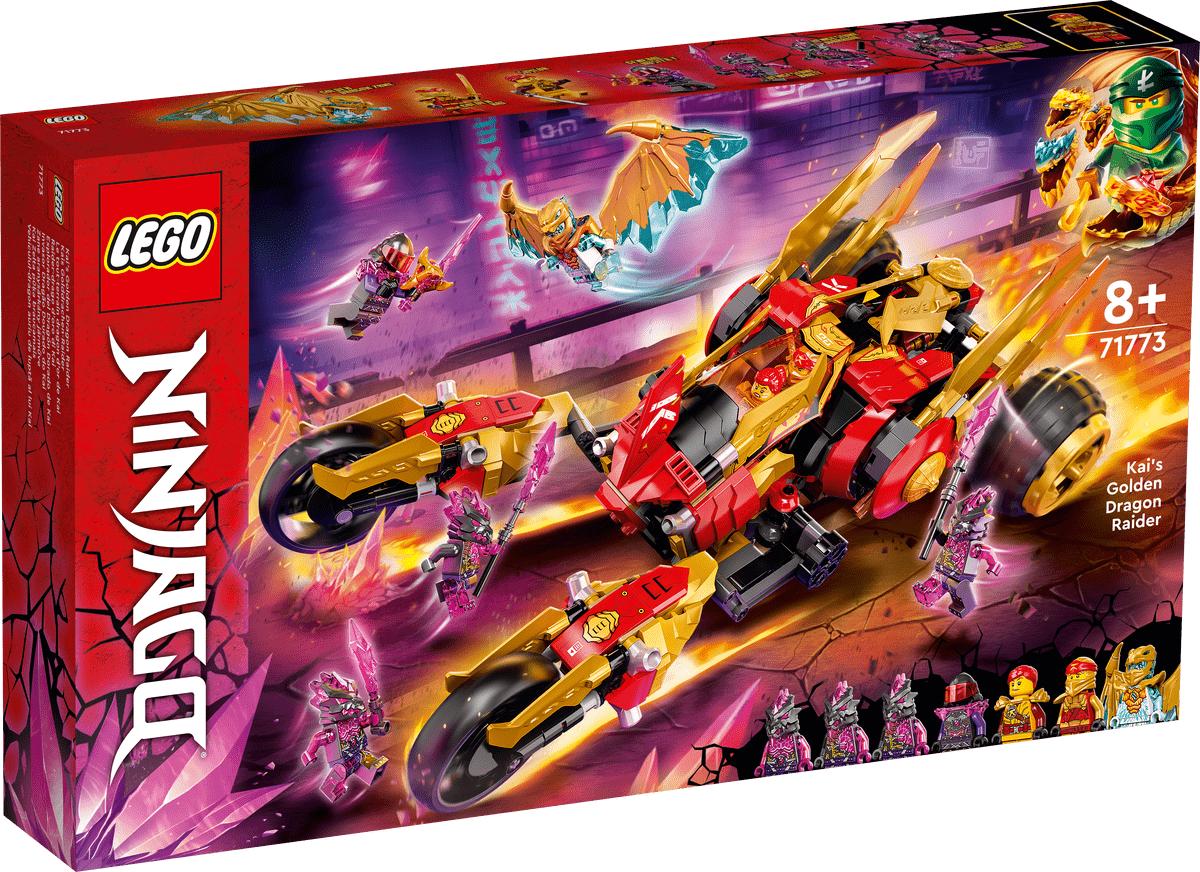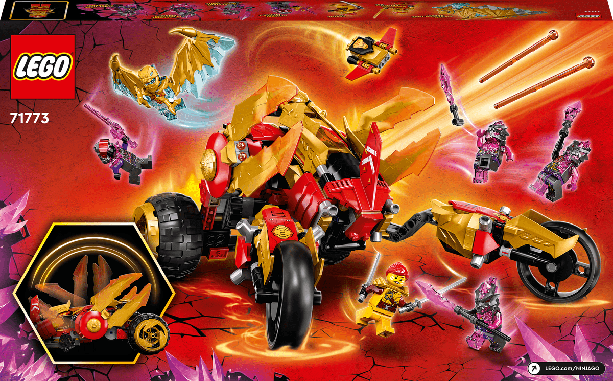 Los niños podrán recrear la acción de la serie para televisión NINJAGO®: Crystallized con este set, que incluye el vehículo Explorador del Dragón Dorado de Kai y 7 minifiguras.